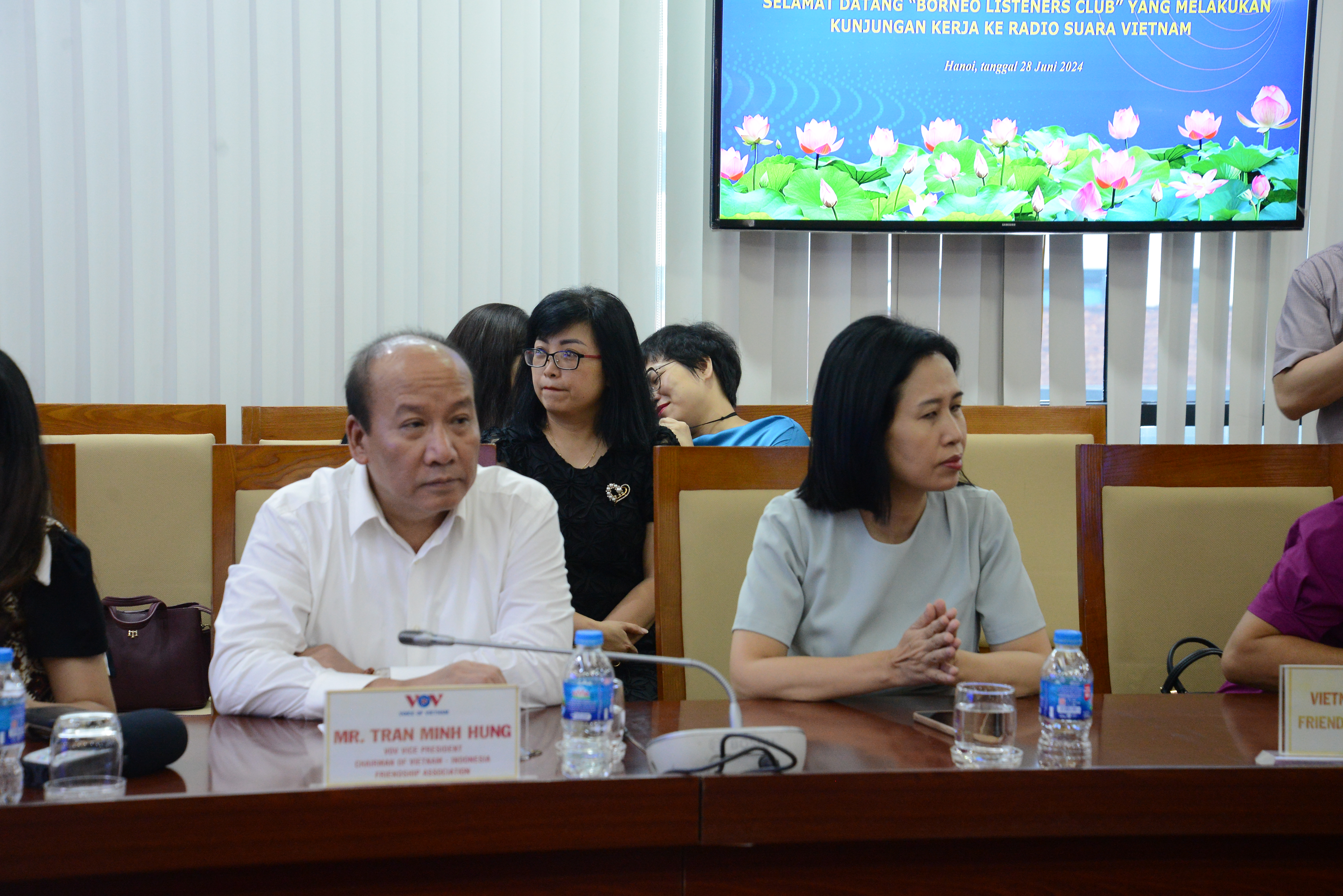 Pada Jumat sore (28 Juni), di Pusat Penyiaran Nasional, Jalan Quan Su nomor 58, di Kota Hanoi, Wakil Direktur Jenderal VOV, Ketua Asosiasi Persahabatan Vietnam-Indonesia, Tran Minh Hung, menerima rombongan pendengar Borneo Listeners Club yang melakukan temu kerja di VOV. Pertemuan ini dihadiri oleh Duta Besar Luar Biasa dan Berkuasa Penuh Indonesia untuk Vietnam, Denny Abdi. |