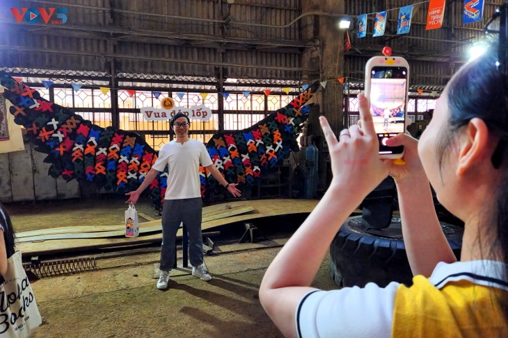 Sayap yang dibuat dari ratusan sandal telah menyerap kedatangan para pemuda untuk checkin.