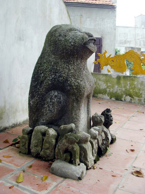 Di satu bukit tinggi di ujung desa, di dekat kuil kuno, ada satu tempat pemujaan yang luasnya kira-kira 10 meter persegi, di sekitarnya ada dinding tinggi dan dua tiang. Di atasnya ada satu kelompok patung anjing yang dibuat batu. Anjing dari batu itu dibuat dari batu hijau, duduk di atas altar pemujaan. Di tengah yalah anjing besar, tingginya kira-kira 1 meter, di sekitarnya yalah kawanan anjing kecil yang dibuat menjadi bermacam-macam bentuk, amat hidup-hidup dan lucu. Kawanan anjing dari batu yang besar dan kecil itu mengarah ke sebalah Barat Laut ke pintu sungai Hat, di tengah dua puncak gunung Ba Vi dan Tam Dao.