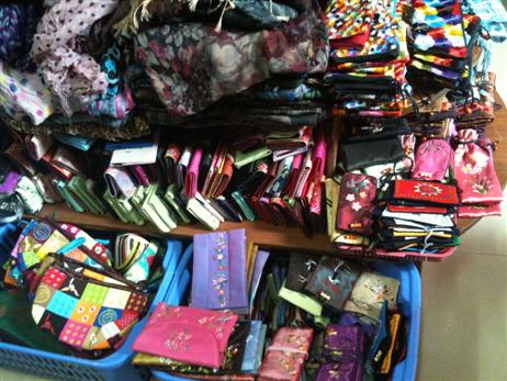 Di dalam toko, produk dari sutra dipajang sana-sini