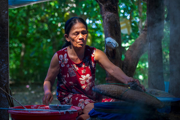 Ibu Ton Nu Thi Nhon telah berpengalaman lebih dari 20 tahun dalam kerajinan pembuatan kulit lumpia basah dan kering. |