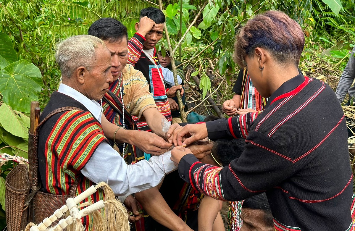Masyarakat Ca Dong mengikatkan benang di tangan sesepuh desa sebagai tanda kepercayaan masyarakat. (Foto: Khanh Nguyen/dantocmiennui.vn) |