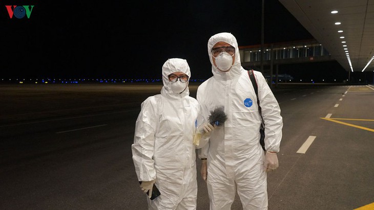 Para wartawan VOV yang melakukan profesi di Bandara Internasional Van Don juga diperlengkapi dengan perlindungan kesehatan khusus untuk menghindari bahaya terinfeksi wabah.