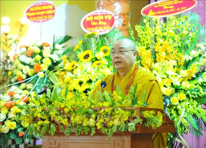 Upadhaya Thic Thanh Nhieu, Wakil Harian Ketua Pengurus Besar Sangha Buddha Viet Nam menyampaikan pesan Waisak 2021 (Foto: Minh Duc/VNA) |