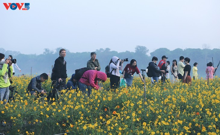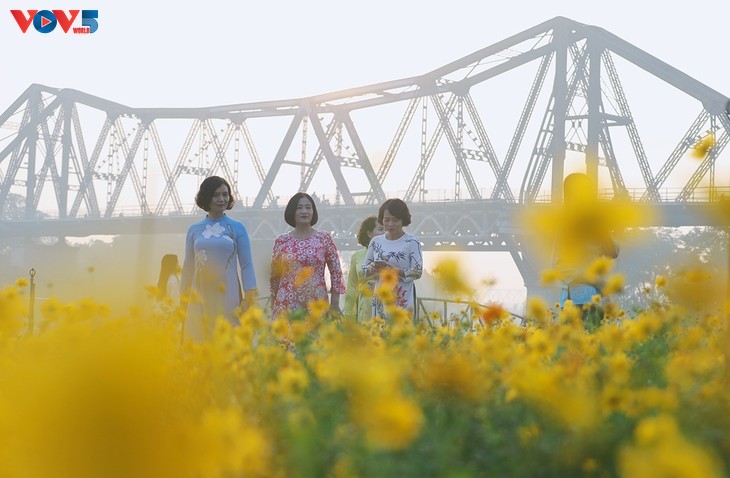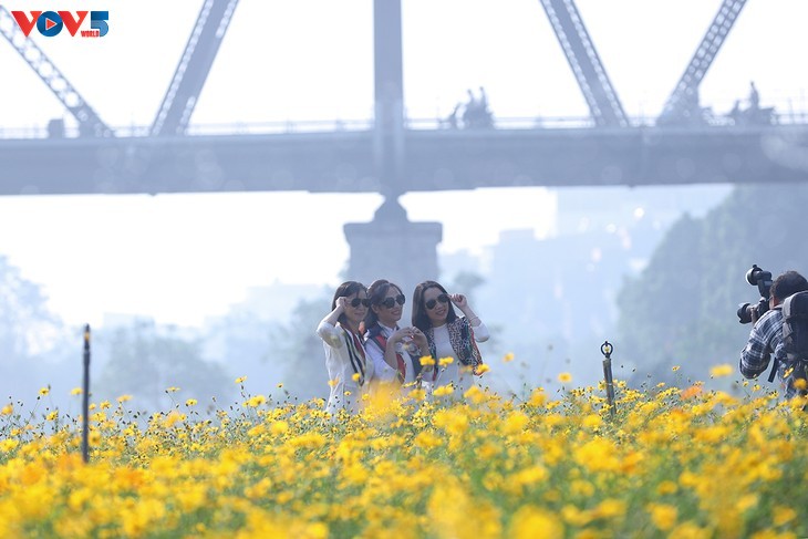Di kaki jembatan Long Bien yang bersejarah, hamparan bunga yang berwarna-warni menarik ratusan wisatawan untuk berkunjung dan mengambil foto setiap hari.