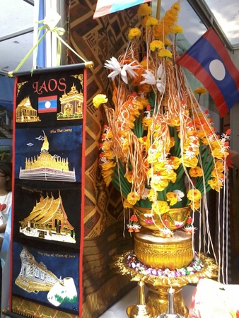Di samping gerai Kedutaan Besar Timor Leste ialah gerai Kedutaan Besar Laos, selain memandangi produk-produk artistik tradisional yang dibuat dari perak secara halus, gambar-gambar tentang pemandangan alam Laos, para pengunjung bisa menikmati kopi atau bir buatan Laos yang dipersilahkan para gadis Laos dalam busana tradisional di sini. Ibu Thong Mi, Atase Kebudayaan Laos di Vietnam memberitahukan: “Selain tujuan berpartisipasi pada pameran kali ini, sehubungan dengan peringatan ultah ke-60 hari pembebasan ibukota Hanoi, kami mau mengundang sahabat-sahabat di dunia untuk datang ke Vietnam guna bersama-sama menikmati suasana damai dan bersahabat, ini adalah hal yang kami semua inginkan. Menurut hemat saya, negara-negara ASEAN supaya melakukan kerjasama dan pertukaran kebudayaan secara lebih banyak lagi melalui pameran seperti ini untuk bisa lebih mengerti tentang kebudayaan seperti cara hidup, aktivitas kehidupan, busana dan lain-lain”.