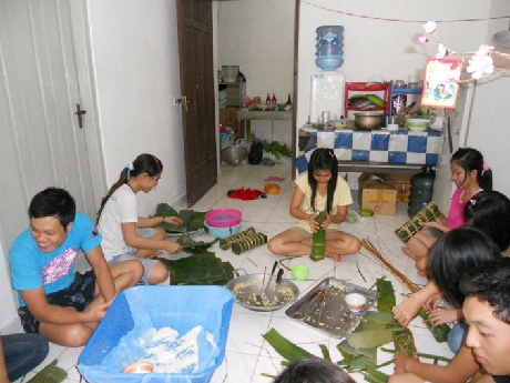Semua masakan khas Hari Raya Tet Vietnam, misalnya kue Chung, manisan dan masakan dari daging babi telah disiapkan cukup banyak. Tran Thi Tinh, mahasiswi Vietnam yang sedang kuliah di UNAS- Indonesia merasa terharu akan persiapan yang cukup banyak dalam Hari Raya Tet Komunitas Vietnam di Indonesia. Dia mengatakan: “Ini adalah untuk pertama kalinya, saya tinggal jauh dari keluarga. Semakin dekat dengan Hari Raya Tet tradisional, saya merasa sedih dan rindu akan keluarga, tetapi hari ini saya bisa datang ke Kedutaan besar Vietnam di Jakarta untuk bersama- sama dengan kakak dan teman –teman membungkusi kue Chung melakukan persiapan untuk Hari Raya Tet tradisional Vietnam. Saya merasa gembira dan berbahagia. Jadi, jauh dari kampung halaman, tapi, saya tetap bisa merayakan Hari Raya Tet tradisional Bangsa Vietnam”.