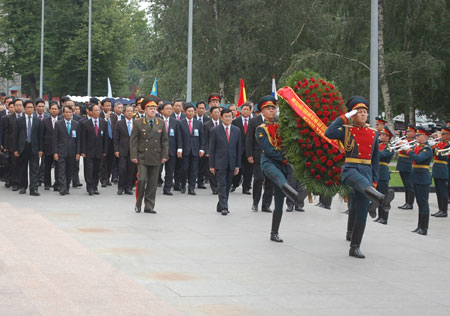 Presiden Trương Tan Sang dan delegasi Vietnam meletakkan karangan bunga pada Tugu Monumen di Rusia.