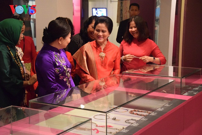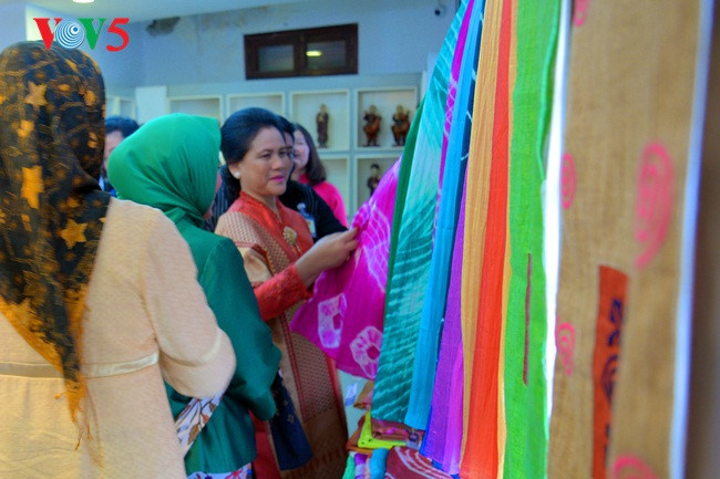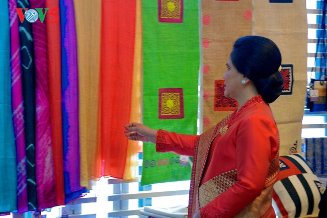 Ibu Negara Indonesia mengunjungi zona memamerkan produk kerajinan tangan dan beliau sangat menyukai sutra Viet Nam. |