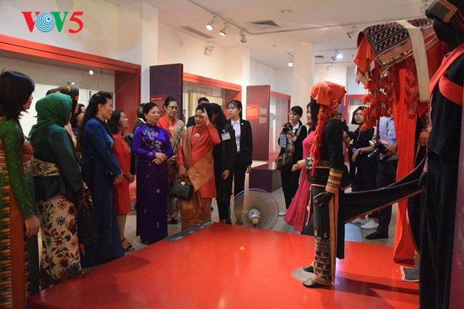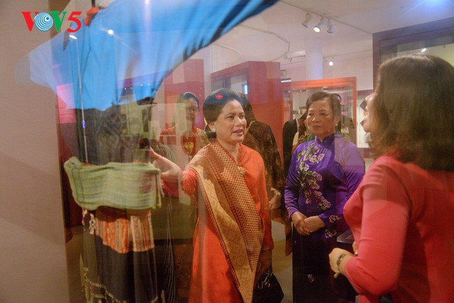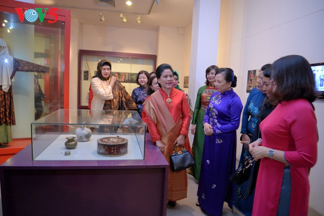 Museum Wanita Vietnam-tempat menyimpan, memamerkan dan merekonstruksi citra perempuan Vietnam dari masa lampau sampai masa kini. Kedua Ibu Negara Vietnam dan Indonesia mendengarkan perkenalan tentang satu pernikahan dari orang etnis minoritas Dao |