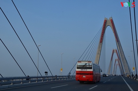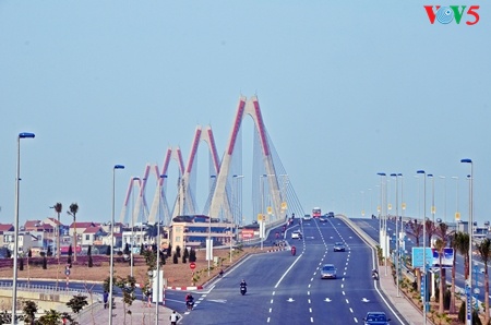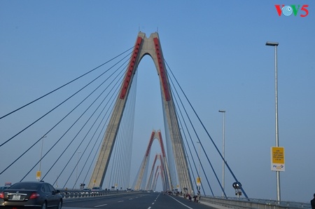| Sekarang, wisatawan yang datang ke ibukota Hanoi dari bandara akan lebih cepat karenamobil berjalan dengan kecepatan 80 km per jam lewat jembatan ini |