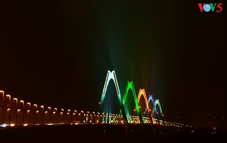| Pada malam hari, jembatan yang tampak bergemerlapan dengan sistem lampu mutakhir pasti akan menjadi destinasi yang atraktif bagi wisatawan ketika datang ke ibukota Hanoi |