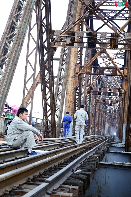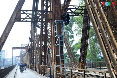| Jembatan Long Bien mempunyai tiga alur , alur tengah untuk kereta api dan dua alur sisanya untuk kendaraan lain, tidak membolehkan mobil lewat |