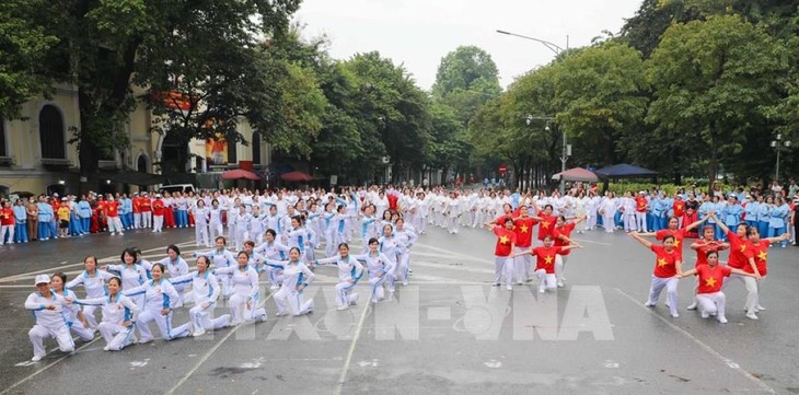 Pada tgl 25 September pagi, Asosiasi Kesehatan Udara Luar untuk Kaum Setengah Baya dan Lansia Ha Noi berkoordinasi dengan Dinas Kebudayaan dan Olahraga Ha Noi mengadakan Program Pertunjukan Bersama Senam Pelihara Kesehatan untuk para lansia, menyebarkan semangat “hidup sehat, hidup remaja”.