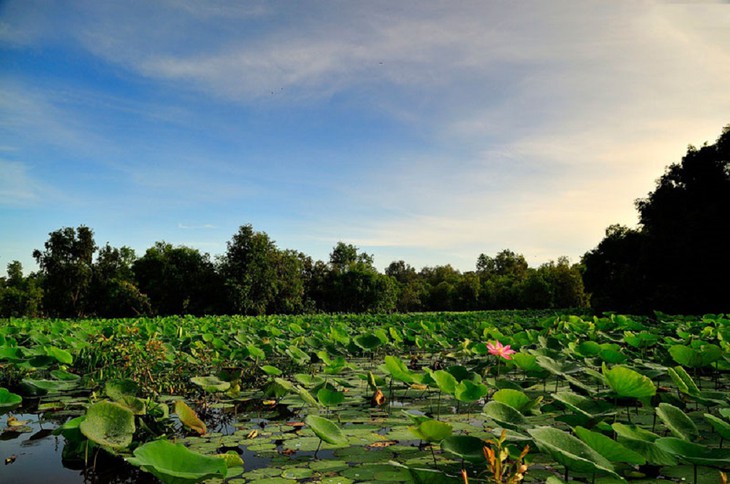 Ladang teratai hijau yang luas sangat menarik bagi siapa pun yang memandangnya. Berbagai jenis teratai tumbuh di kedua sisi jalan menuju hutan bakau (Foto: Portal web An Giang)