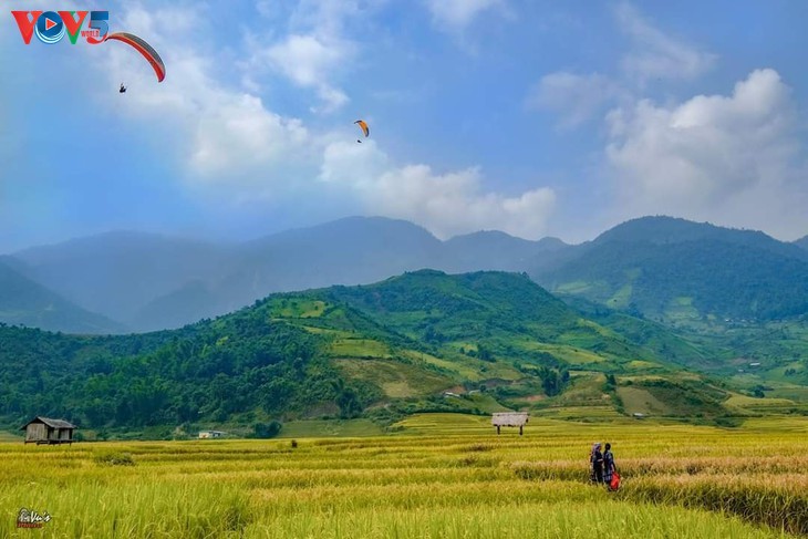 Di samping memandangi pemandangan yang megah dan mencari tahu tentang kehidupan warga, kegiatan yang sangat ditunggu-tunggu pada festival tersebut adalah Festival paralayang “Terbang di atas padi yang menguning”. Kegiatan ini selalu menyerap partisipasi banyak pilot dari dalam dan luar negeri. Itu merupakan aksentuasi dan menciptakan daya tarik bagi Hari Raya di Mu Cang Chai.