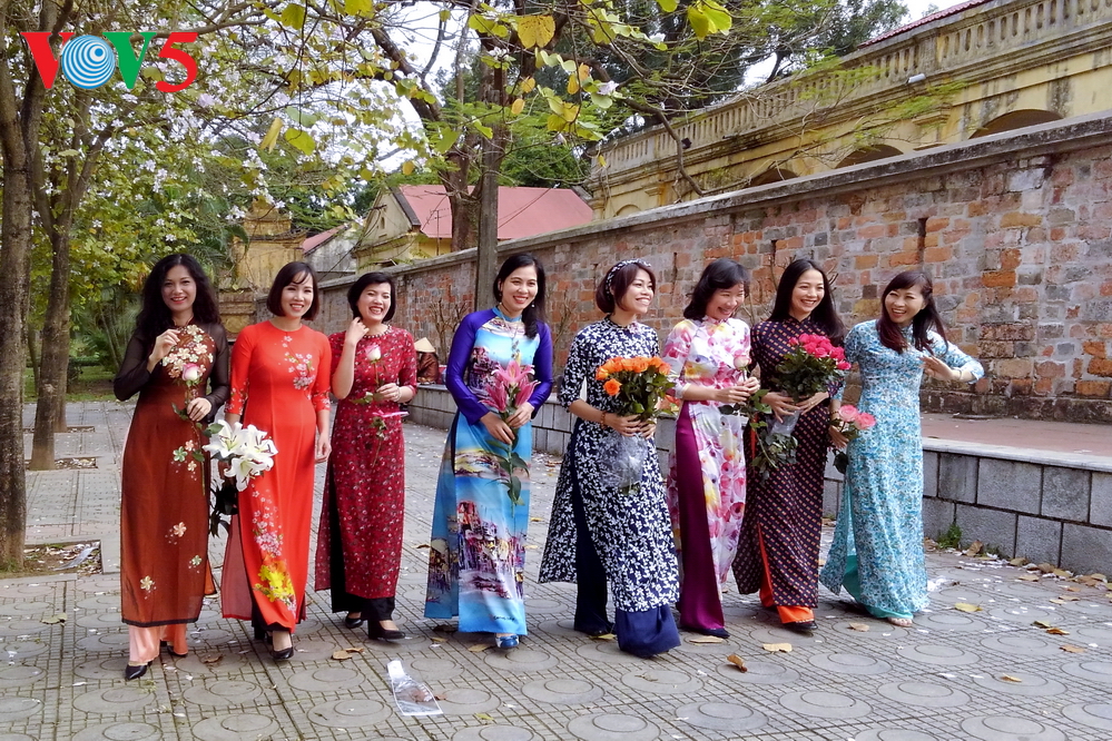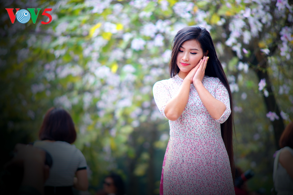 Para pemudi dalam pakaian Ao Dai (baju panjang tradisional) berpotret dengan bunga Ban di Jalan Hoang Dieu yang berhadapan dengan Jalan Bac Son