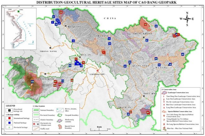 Geopark Global UNESCO gunung dan sungai Cao Bang luasnya kira-kira 3 300 Km2 di wilayah 9 kabupaten. Para ilmuwan telah menemukan 130 tempat pusaka geologi yang unik, dengan bentuk-bentuk, lanskap batu kapur yang beraneka-ragam, pemandangan alam seperti danau Thang Hen, taman nasional Phia Oac-Phia Den, air terjun Ban Gioc, salah satu di antara empat daerah perbatasan besar dan paling indah di dunia. Geopark Cao Bang ada banyak situs peninggalan sejarah dan budaya yang terkenal di dalam dan luar negeri seperti gua Pac Bo, sungai Lenin. (Foto : Hachi.)