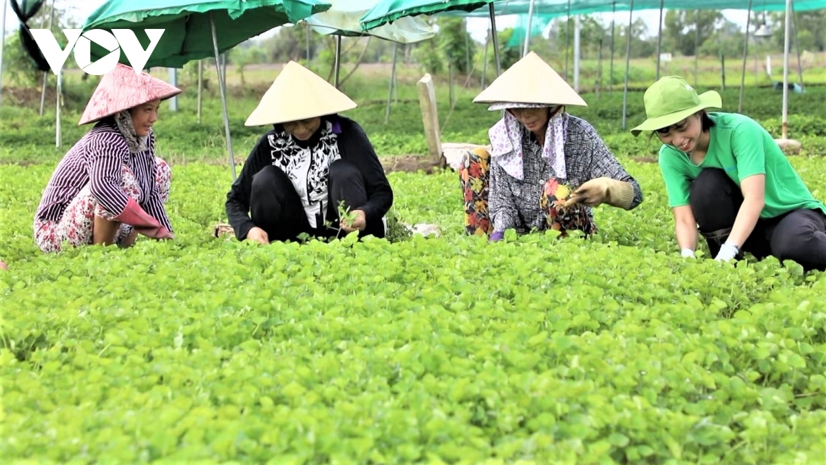 Nguyen Ngoc Huong (baju hijau) bersama-sama bekerja dengan para petani untuk membangun perkebunan pegagan yang bersih (Foto: VOV) |