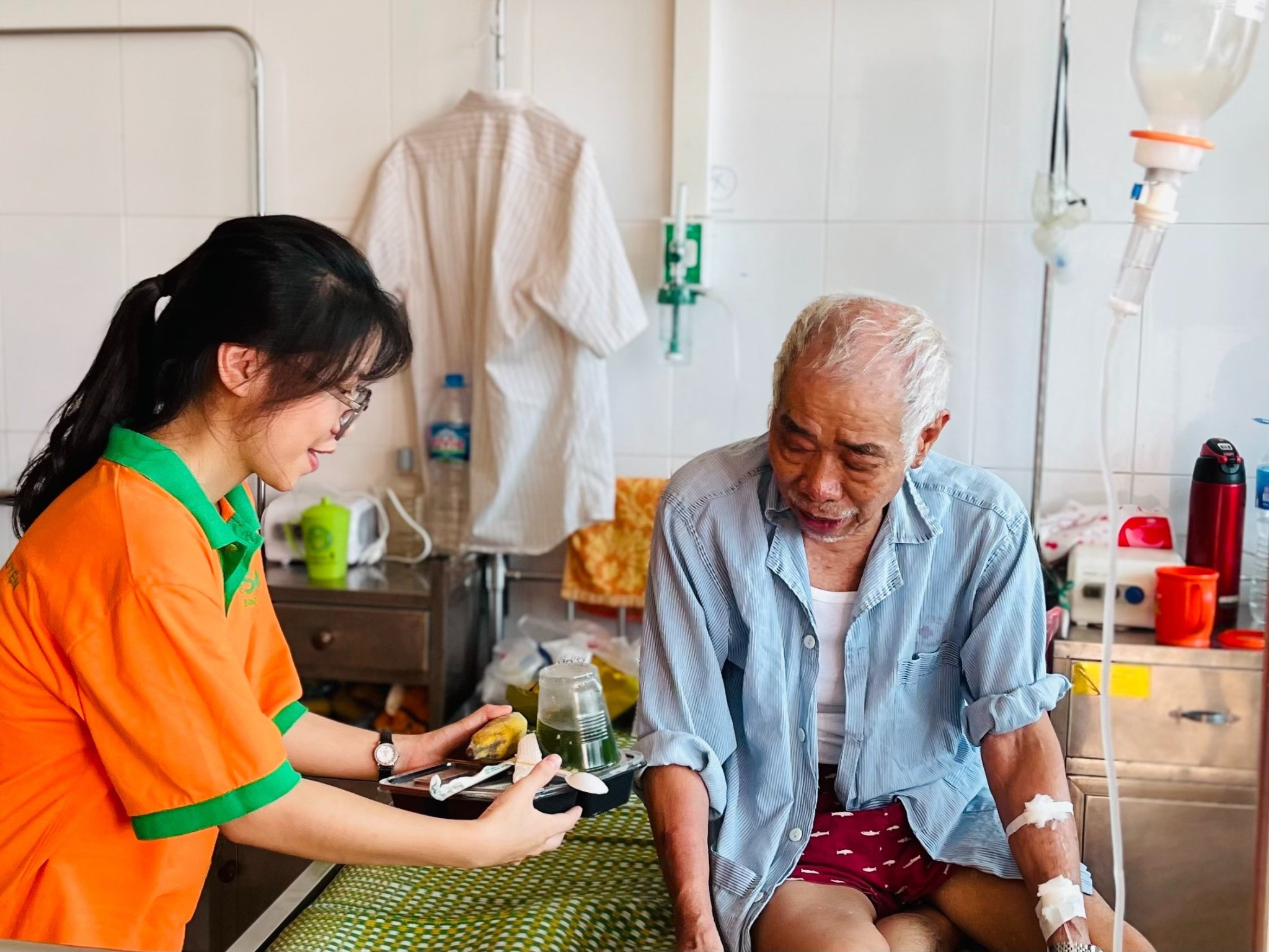Memegang porsi nasi subsidi, para pasien yang sedang berobat di Rumah Sakit Thanh Nhan sangat terharu.