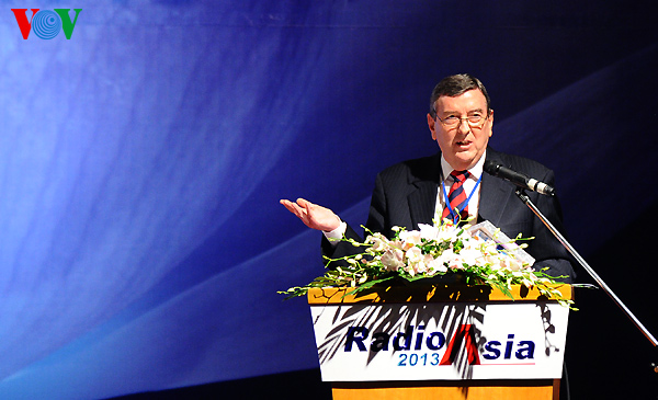 Profesor Martin Hadlow, Sekretaris Jenderal Pusat Informasi Pers dan Komunikasi Asia (AMIC) membaca pidato untuk menutup konferensi ini dan memberikan apresiasi terhadap persiapan cermat dari Radio Suara Vietnam, turut mensukseskan Konferensi Radio Asia-2013.