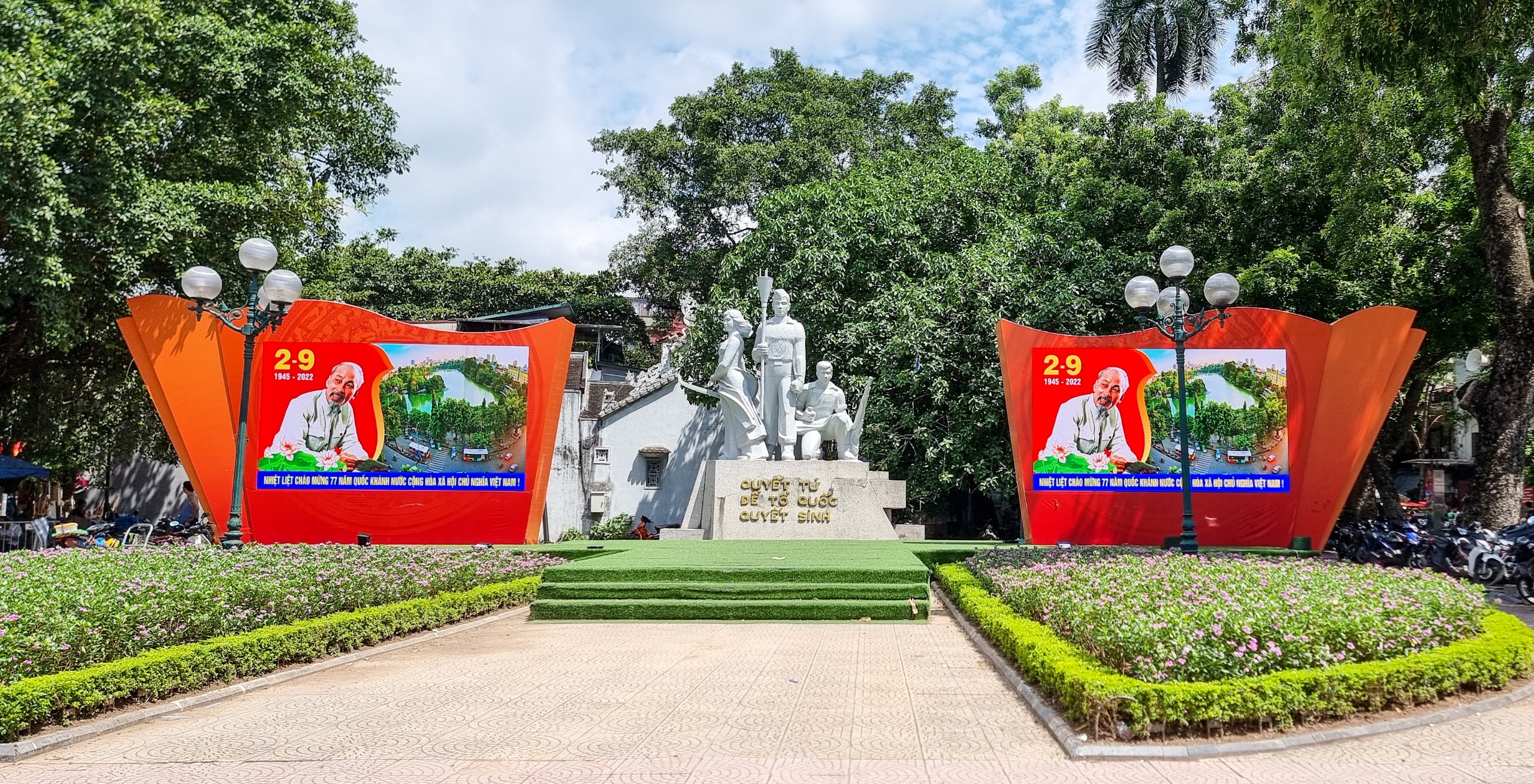 Zona Tugu Monumen Bunuh Diri (Distrik Hoan Kiem) dipasang 2 layar led untuk menayangkan video perayaan HUT ke-77 Hari Nasional 2 September. |