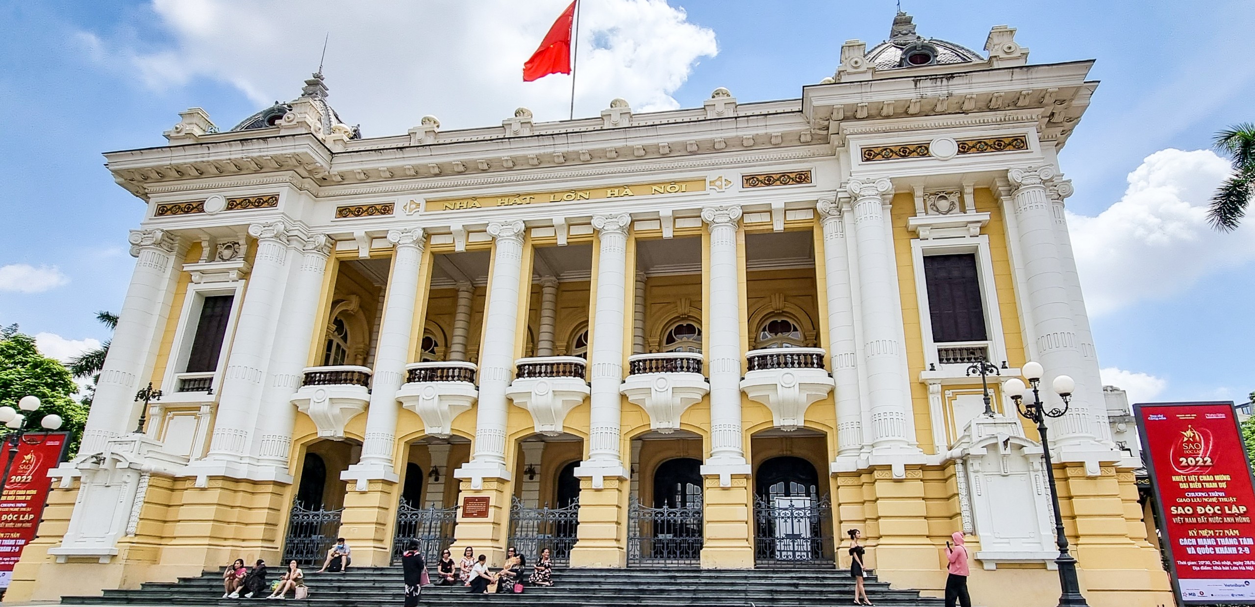 Warna bendera merah bintang kuning kelihatan di semua jalan di Kota Hanoi.