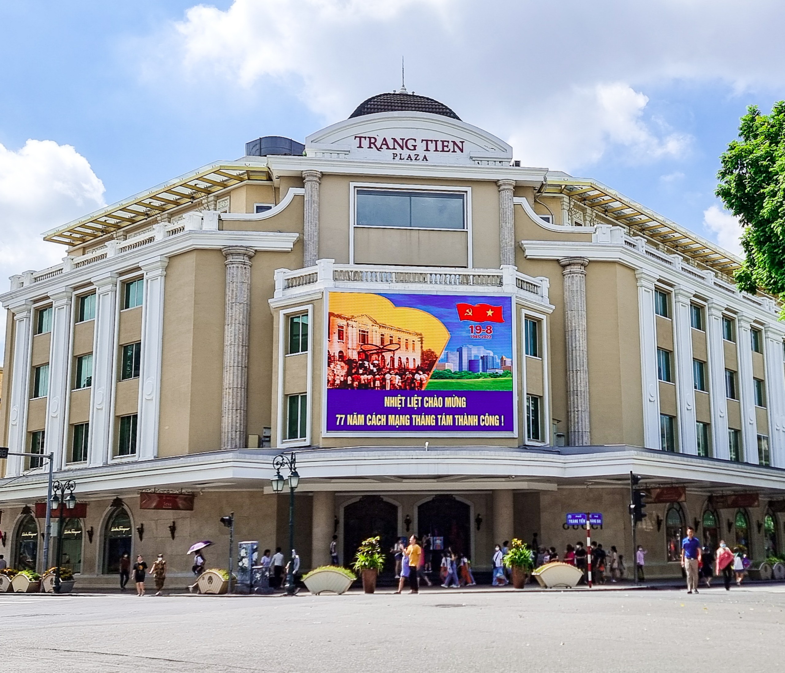 Di zona pusat ibukota Hanoi, layar Led ukuran besar yang ditempatkan di depan Pusat Komersial Trang Tien menampilkan video perayaan HUT ke 77 Revolusi Agustus dan Hari Nasional 2 September. |