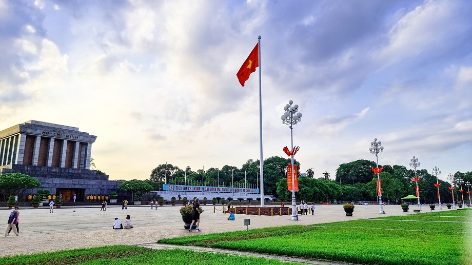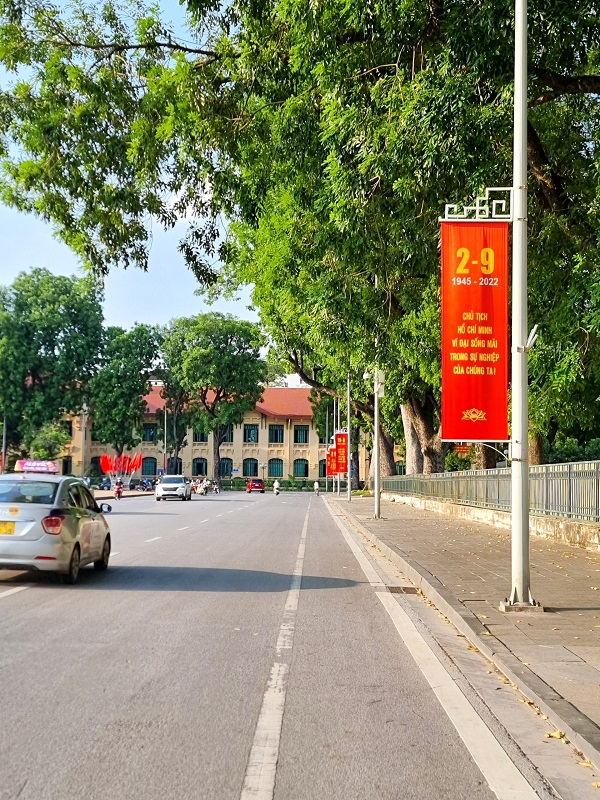 Lapangan Ba Dinh- tempat dimana Presiden Ho Chi Minh membacakan Deklarasi Kemerdekaan melahirkan Republik Demokratik Vietnam (sekarang Republik Sosialis Vietnam), juga didekorasi untuk menyambut warga dan pengunjung yang datang berjiarah kepada Beliau di Musim Gugur Kemerdekaan.