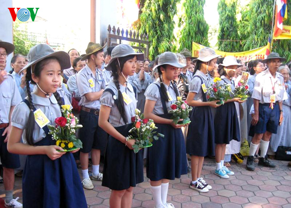 | Penganut Buddhis memegang buket bunga berkiblat ke Hari Lahirnya Sang Buddha |