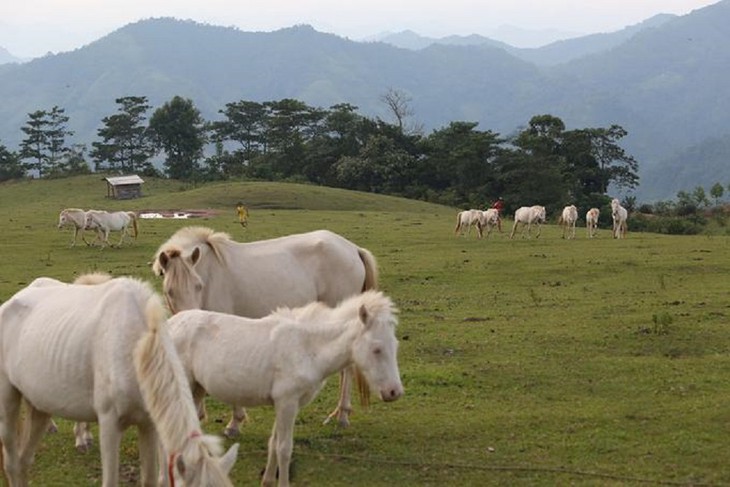 Di Khau Sao ada ribuan ekor kuda yang digembalakan. Khususnya di sini terdapat jenis kuda putih ras dengan bulunya berwarna putih, kulitnya putih merah muda, kelopak mata merah muda (Foto: baolangson.vn)