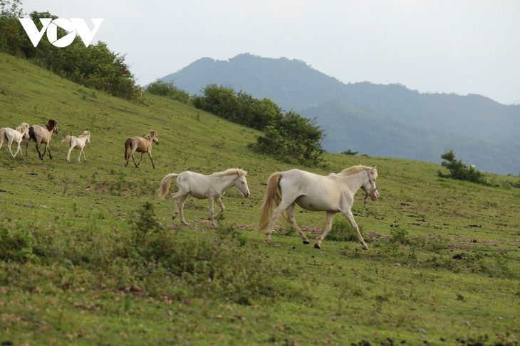 Kuda-kuda putih dengan santai makan rumput dan bermain-main di tengah bukit hijau telah menjadi "kekhasan" di sini (Foto: dantri.com.vn)