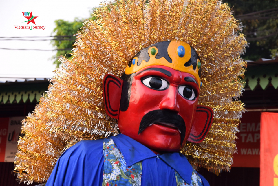 Muka Ondel-ondel dicat dengan dua warna utama ialah putih dan merah, rambutnya dibuat dari serat pohon sawi |