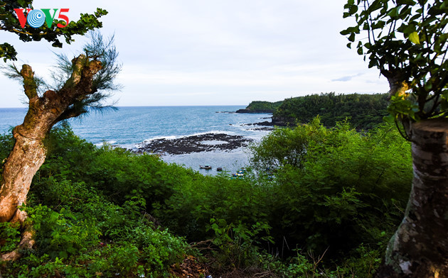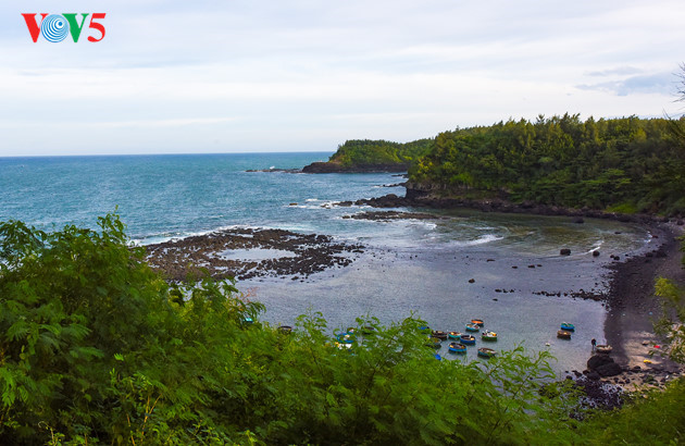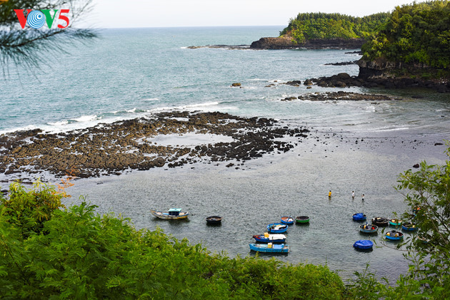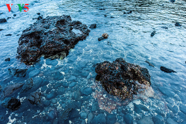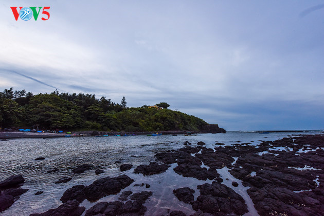 Dilihat dari pos mercusuar Ba Lang An, kawah gunung berapi purba berangsur-angsur timbul ketika pasang laut surut. |