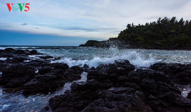 Panorama kawah gunung berapi di pantai Ba Lang An berubah terus-menerus siang-malam |