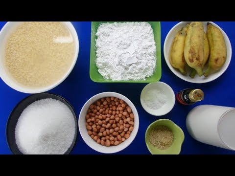 Pisang masak: 7-8 buah, garam: setengah sendok kopi, santan: 500 ml, gula putih: 3 sendok, tepung enau, kelapa, kacang hijau