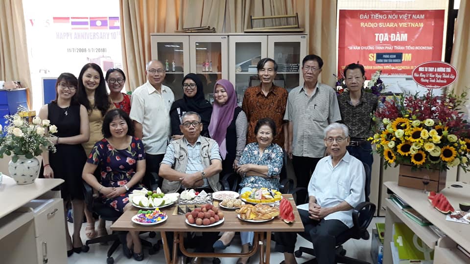 Kepala Kepala Departemen Siaran Luar Negeri (VOV5), Nguyen Tien Long (yang diri keempat dari kiri) dan para penyiar, mantan penyiar serta pembantu Program Siaran Bahasa Indonesia dalam acara peringatan HUT ke-53 |