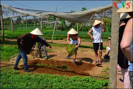 | Wisatawan mengenakan baju yang berwarna coklat nampak seperti petani sesungguhnya dan mulai mengunjungi ladang sayuran |