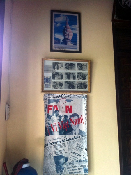 | Koran dan slogan tentang pahlawan Nguyen Van Troi ditempel pada dinding |