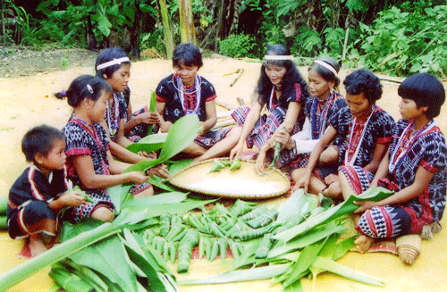 Warga etnis minoritas Co Tu membungkus kue Cuoc untuk menyiapkan adat R'dao (Foto: VOV) |