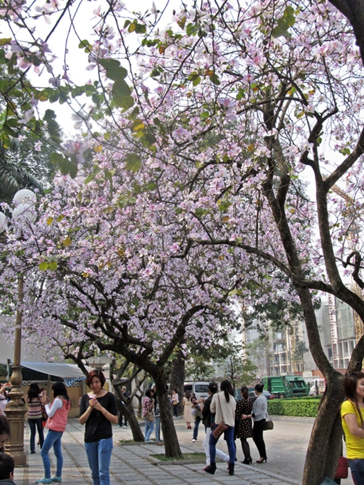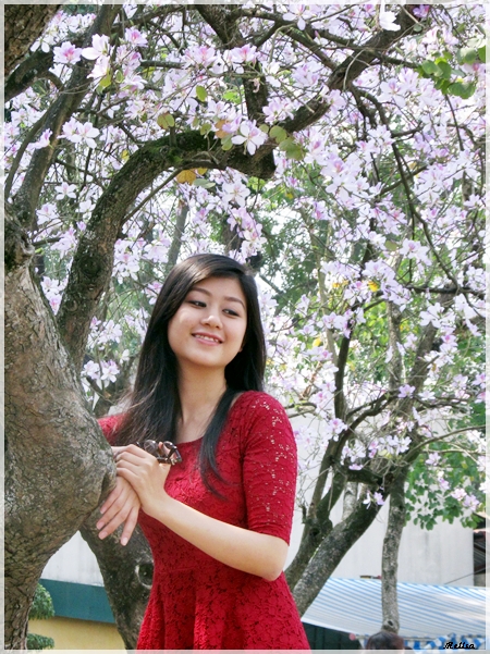 | Gadis Hanoi di samping pohon bunga Ban. |