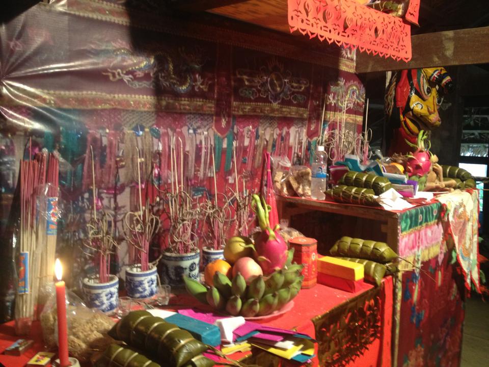 Pada Hari Raya Tet, orang etnis Tay menyiapkan secara teliti berbagai masakan yang dibuat dari hasilan setempat untuk dipersembahkan kepada nenek moyang. Di altar pemujaan di tengah rumah, talam sajian yang lengkap dan semuanya enak disiapkan untuk menyongsong Hari Raya Tet dalam kecukupan dan ketenteraman. Semua barang persembahyangan ini diletakkan di altar pemujaan nenek moyang memanifestasikan hati dan balas budi dari anak-cucu kepada para orang tuanya.