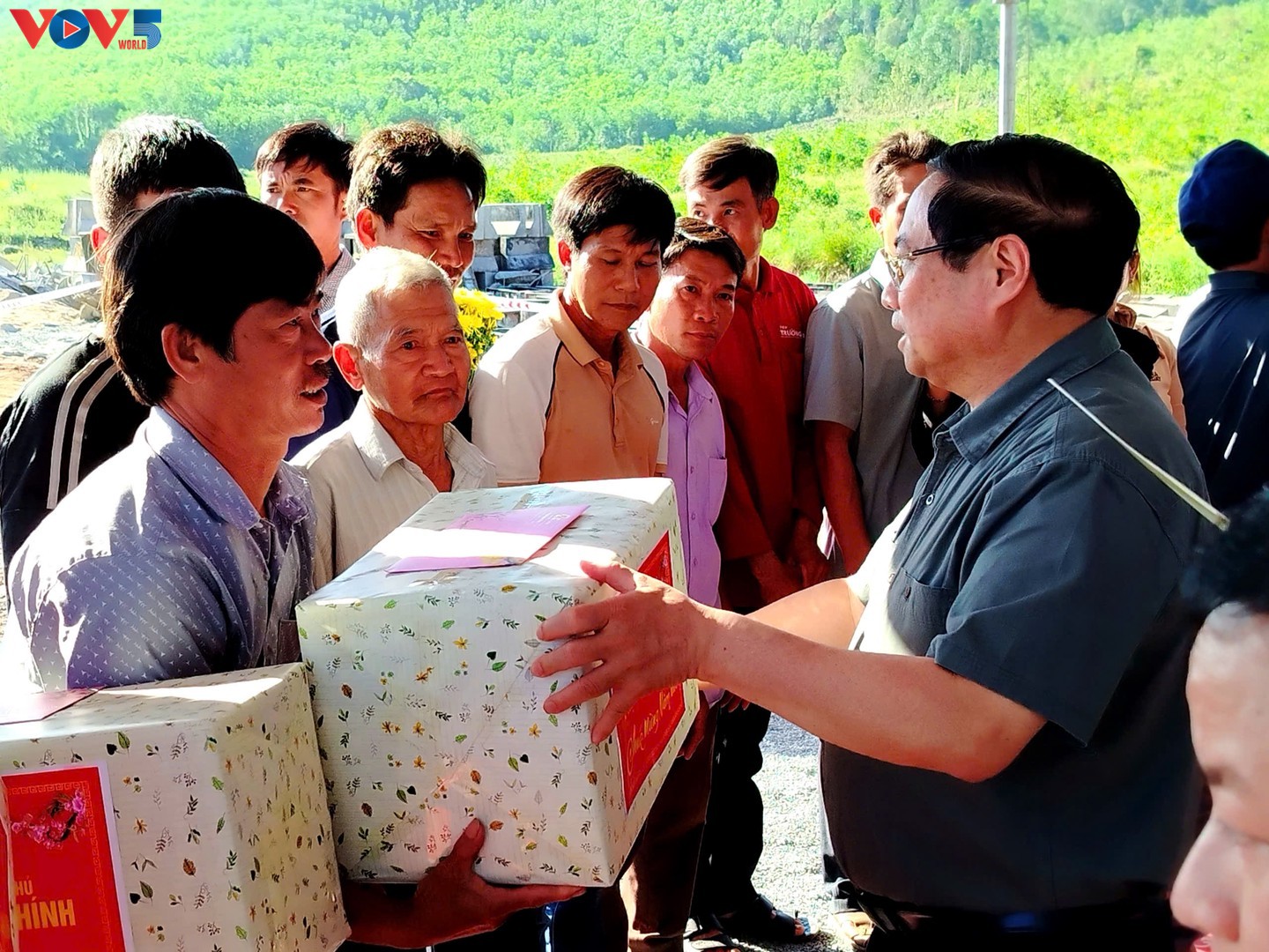 PM Pham Minh Chinh mengunjungi berbagai keluarga di Daerah Relokasi Dusun Quang Duc. Foto: VOV |