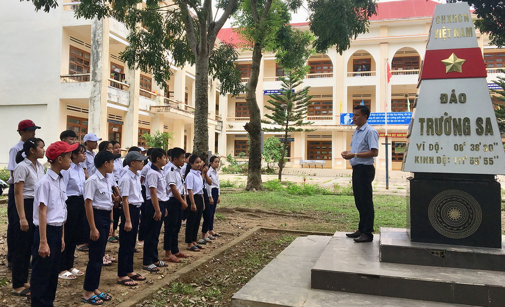 Pak guru Duong Van Van dan para pelajar di samping pola "Tonggak garis perbatasan Truong Sa" di dalam taman kompus sekolah tersebut (Foto: VOV) |