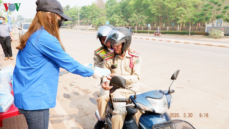 Para mahasiswa Vietnam di Laos memberikan masker kepada para polisi Laos yang sedang melakukan tugas (Foto: VOV) |