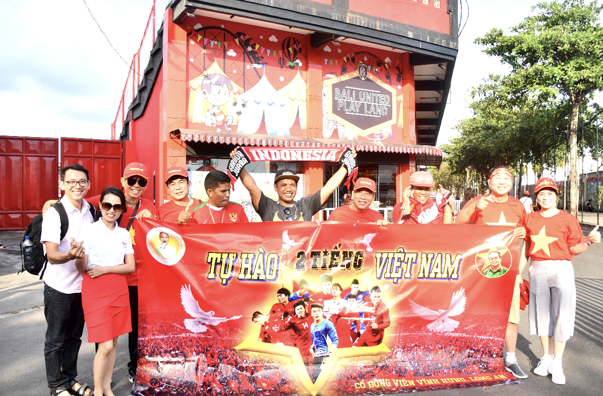 | Para pendukung Vietnam dan Indonesia menyatakan persahabatan |