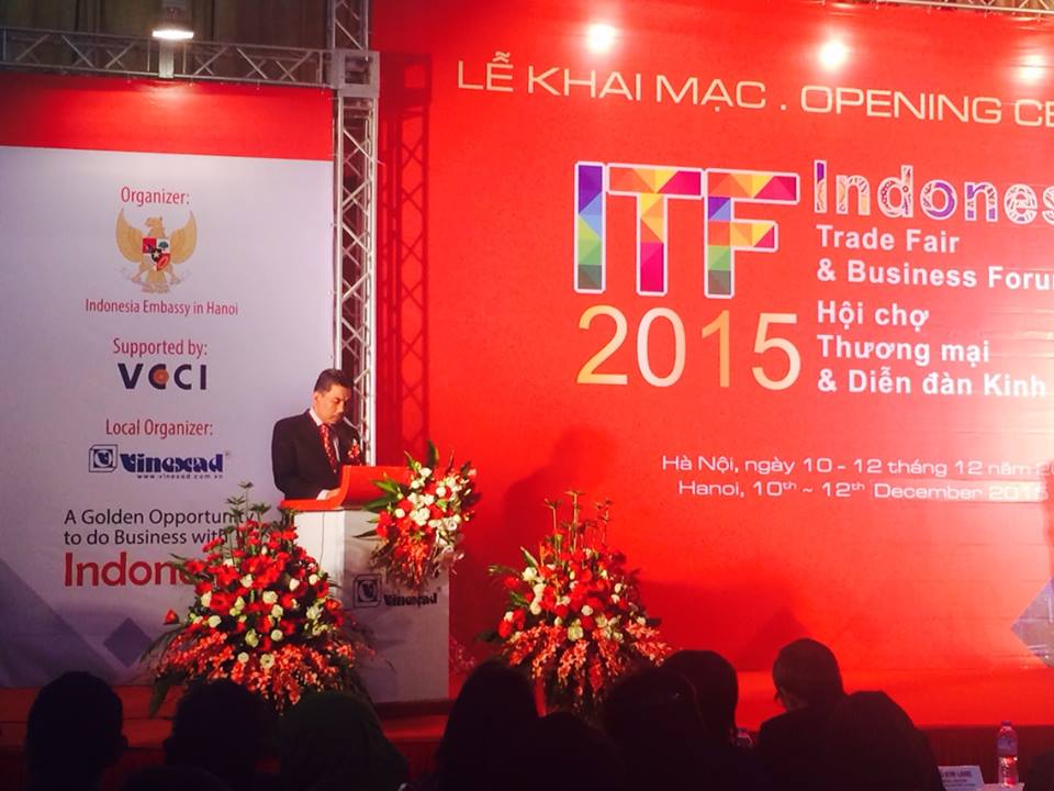 (VOVworld) – Sehubungan dengan kesempatan ultah ke-60 penggalangan hubungan diplomatik antara Indonesia dan Vietnam (1955-2015), Pekan Raya Perdagangan Indonesia dibuka di kota Hanoi, Kamis pagi (10/12). Ada kira-kira 100 badan usaha, perusahaan asal Indonesia yang telah ikut memperkenalkan berbagai produk tipikal, beraneka-ragam dan berkualitas tinggi seperti suku cadang mobil, permesinan, minyak dan batu bara, pembangunan dan konsultasi, farmasi, bahan makanan, jasa investasi, tekstil, dll.