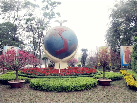 | Simbol negara Vietnam di tengah bunga-bungaan |