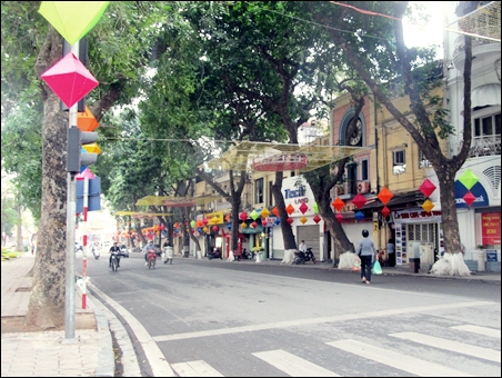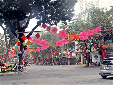 | Jalan Ba Trieu dihias dengan banyak bunga Mei buatan |