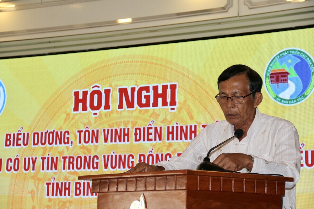 Bapak Huynh Van Co berbicara di depan konferensi memuliakan orang yang berwibawa tipikal dalam kalangan warga etnis minoritas Provinsi Binh Thuan tahun 2023 (Foto: Doan Si) |